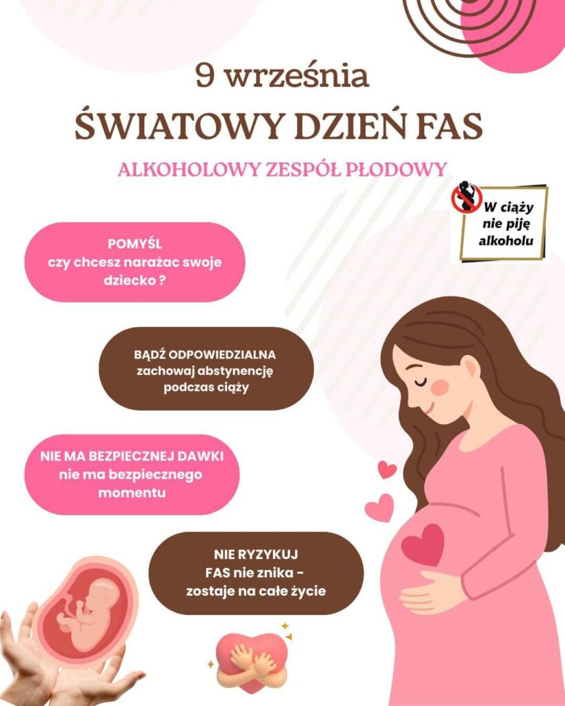 Światowy Dzień FAS był obchodzony 9 września. Skrót „FAS” oznacza „fetal alcohol syndrome” – alkoholowy zespół płodowy. Dzień ten odbył się po raz pierwszy w Auckland w Nowej Zelandii w 1999 roku i zaczyna się corocznie o godzinie 9.09. Powtarzające się w dacie i godzinie dziewiątki nie są przypadkowe – symbolizują 9 miesięcy ciąży bez alkoholu. Alkoholowy zespół płodowy pojawia się na skutek spożywania alkoholu przez matkę w trakcie ciąży. Jest to zaburzenie nieuleczalne, trwające całe życie. Nie jest to zaburzenie genetyczne – jest ono skutkiem uszkodzenia płodu przez alkohol. Cechuje się głównie zmianami w wyglądzie twarzy, zaburzeniami rozwoju oraz uszkodzeniem układu nerwowego. Charakterystyczne zmiany w wyglądzie twarzy dziecka dotkniętego alkoholowym zespołem płodowym to między innymi małe oczy z opadającymi powiekami, wygładzona rynienka nosowa, cienka górna warga i krótki nos. Zaburzenia rozwoju, które mogą pojawić się u dziecka z alkoholowym zespołem płodowym, to między innymi opóźniony wzrost, niska waga i wzrost w stosunku do wieku, zniekształcone stawy, kończyny i palce, mały obwód głowy oraz krótka szyja. Wynikające z alkoholowego zespołu płodowego uszkodzenie układu nerwowego może doprowadzić do niepełnosprawności fizycznej i intelektualnej – dziecko może mieć trudności z motoryką, pamięcią, uczeniem się, komunikowaniem się lub rozumieniem innych osób i otoczenia. Poza alkoholowym zespołem płodowym spożywanie alkoholu w trakcie ciąży może doprowadzić do poronienia, przedwczesnego porodu, wewnątrzmacicznego obumarcia płodu lub nagłej śmierci łóżeczkowej. Już po około 40 minutach od spożycia alkoholu przez matkę jego stężenie we krwi płodu jest porównywalne z jego stężeniem we krwi matki. Zmiany wywołane alkoholowym zespołem płodowym są nieodwracalne – jedynymi metodami leczenia są wspieranie rozwoju dziecka, rehabilitacja ruchowa i terapia zaburzeń współistniejących. Jedynym sposobem, aby zapobiec alkoholowemu zespołowi płodowemu, jest całkowita abstynencja od alkoholu nie tylko w trakcie ciąży, ale również w okresie planowania zajścia w ciążę. Uznaje się, że nie istnieje bezpieczna ilość alkoholu, którą można spożyć w trakcie ciąży – nawet małe ilości alkoholu mogą spowodować szkody w rozwoju płodu. Dlatego niezwykle ważne jest całkowite wstrzymanie się od alkoholu przez przyszłą matkę.