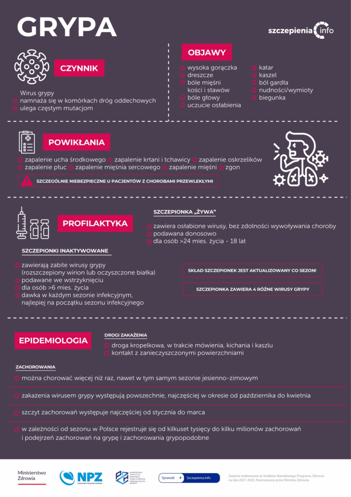 Co roku w Polsce notuje się od kilkuset tysięcy do kilku milionów zachorowań lub podejrzeń zachorowań na grypę. Najwięcej zachorowań obserwuje się w okresie od stycznia do marca. Według Głównego Inspektora Sanitarnego w poprzednim sezonie grypowym na grypę zachorowało ponad 2 miliony osób. Choć choroba zwykle przebiega łagodnie, może prowadzić do groźnych powikłań, a nawet hospitalizacji lub zgonu – szczególnie u osób z grupy ryzyka, w tym osób starszych lub chorujących przewlekle. Rozprzestrzenianie się wirusa grypy można ograniczyć zachowując podstawowe zasady higieny – mycie lub dezynfekcja rąk, unikanie dotykania twarzy, zasłanianie ust i nosa kichając lub kaszląc, unikanie skupisk ludzi (zwłaszcza w okresie zwiększonej zachorowalności), regularne wietrzenie pomieszczeń, zachowanie dystansu od innych osób (zwłaszcza jeśli kaszlą lub kichają) i pozostawanie w domu, jeśli czujemy się źle lub mamy objawy choroby. Najskuteczniejszą ochroną jest coroczne szczepienie się przeciw grypie, zalecane wszystkim osobom od 6. miesiąca życia. Ponieważ na wykształcenie odporności po szczepieniu potrzeba od 2 do 3 tygodni, warto zaszczepić się jak najwcześniej. W sezonie grypowym 2025/2026 stosowane są szczepionki inaktywowane Influvac Tetra, Vaxigrip Tetra oraz Efluelda Tetra, która ma zwiększoną zawartość antygenów i jest przeznaczona dla osób starszych w wieku od 60 lat. Szczepionki przeciw grypie są bezpłatne dla osób w wieku od 6 miesięcy do 18 lat, osób starszych w wieku od 65 lat oraz kobiet w ciąży. Dla pozostałych osób są dostępne z 50-procentową refundacją. Tą samą refundacją objęta jest szczepionka Efluelda Tetra, która jest płatna również dla osób od 65. roku życia. Żywa szczepionka donosowa nie jest obecnie dostępna. Szczepionki przeciw grypie są wydawane na receptę. Szczepienia prowadzone są w przychodniach podstawowej opieki zdrowotnej oraz – w przypadku osób pełnoletnich – w aptekach, które nawiązały umowę z Narodowym Funduszem Zdrowia. Lista aptek, w których można zaszczepić się przeciw grypie, jest dostępna na stronie: pacjent.gov.pl/aktualnosc/zaszczep-sie-w-aptece.
