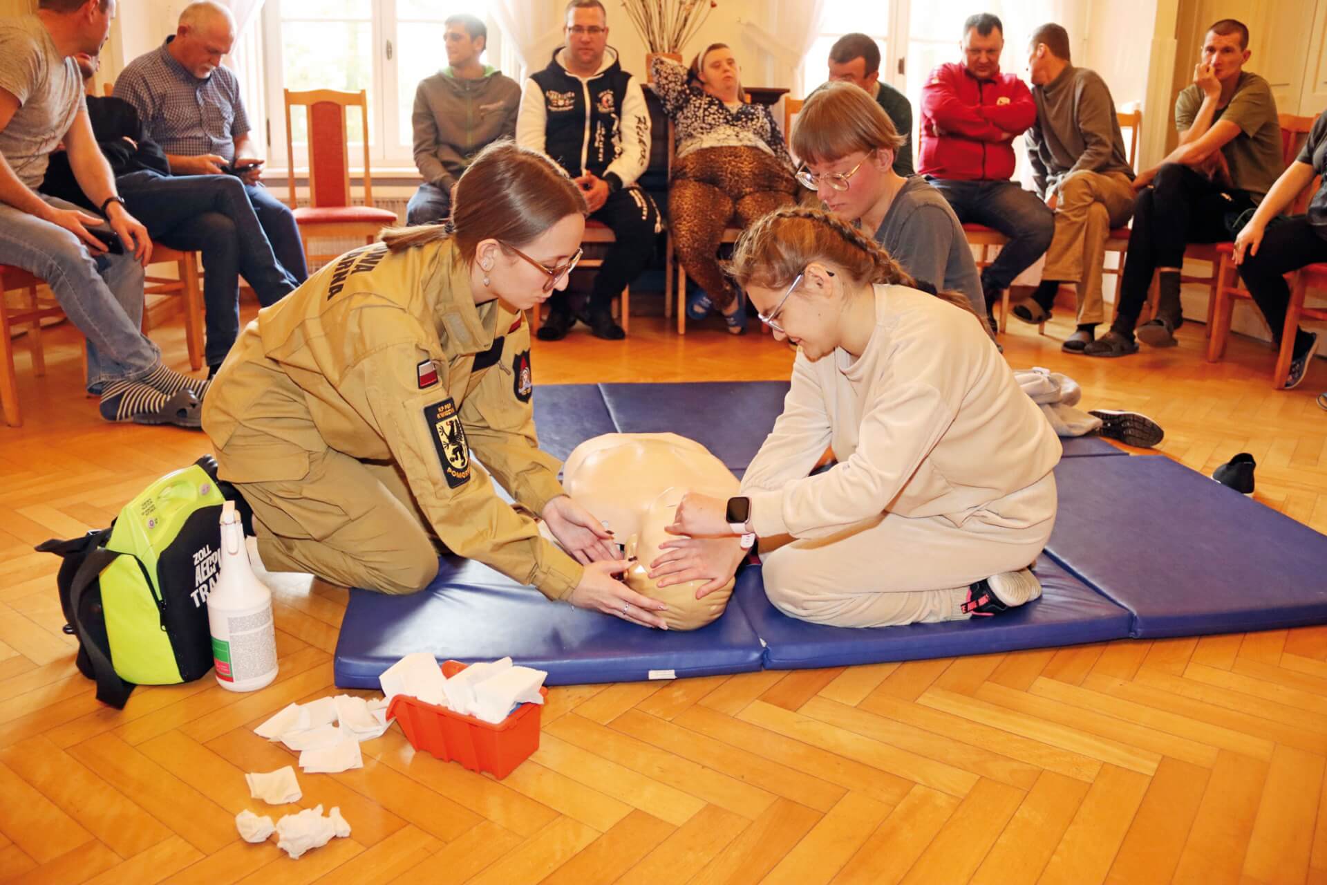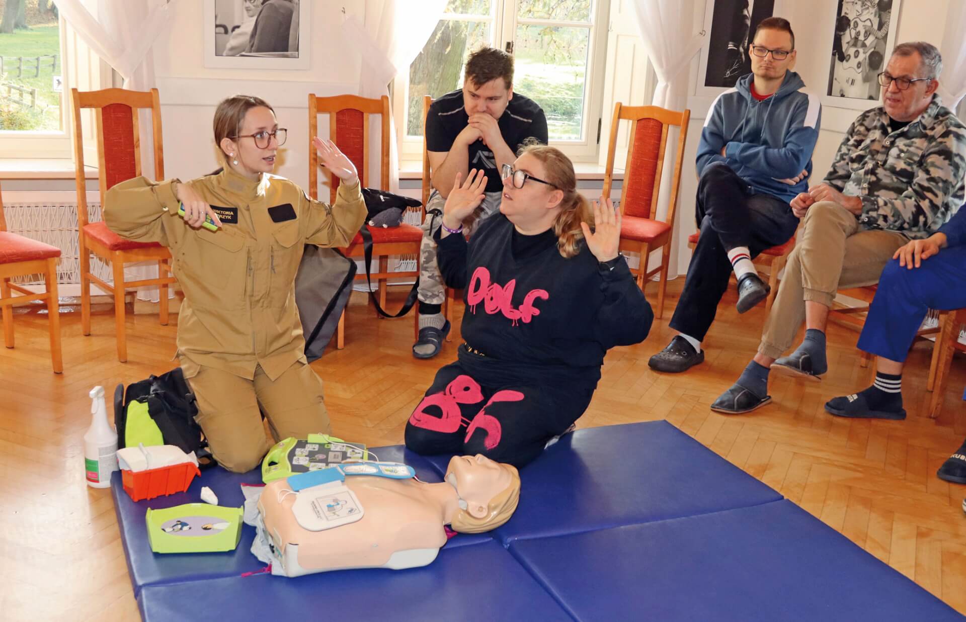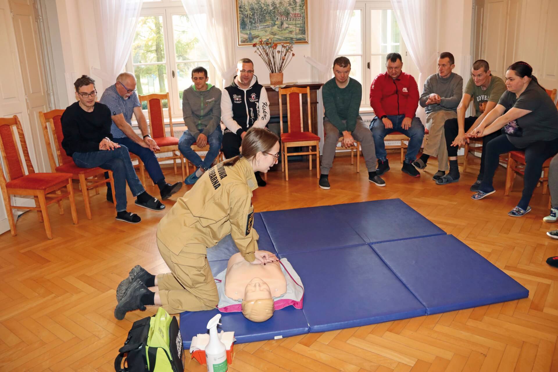 Uczestnicy i pracownicy Warsztatu Terapii Zajęciowej w Górkach, prowadzonego przez Fundację „Misericordia”, wzięli udział w szkoleniu dotyczącym udzielania pierwszej pomocy. To kolejne tego typu szkolenie, zarówno dla pracowników, jak i uczestników warsztatu. Poprowadzili je st. kpt. Krzysztof Skoczek oraz str. Wiktoria Jerzyk z Komendy Powiatowej Państwowej Straży Pożarnej w Kwidzynie. Uczestnicy i pracownicy Warsztatu Terapii Zajęciowej w Górkach, prowadzonego przez Fundację „Misericordia”, wzięli udział w szkoleniu dotyczącym udzielania pierwszej pomocy. To kolejne tego typu szkolenie, zarówno dla pracowników, jak i uczestników warsztatu. Poprowadzili je st. kpt. Krzysztof Skoczek oraz str. Wiktoria Jerzyk z Komendy Powiatowej Państwowej Straży Pożarnej w Kwidzynie.