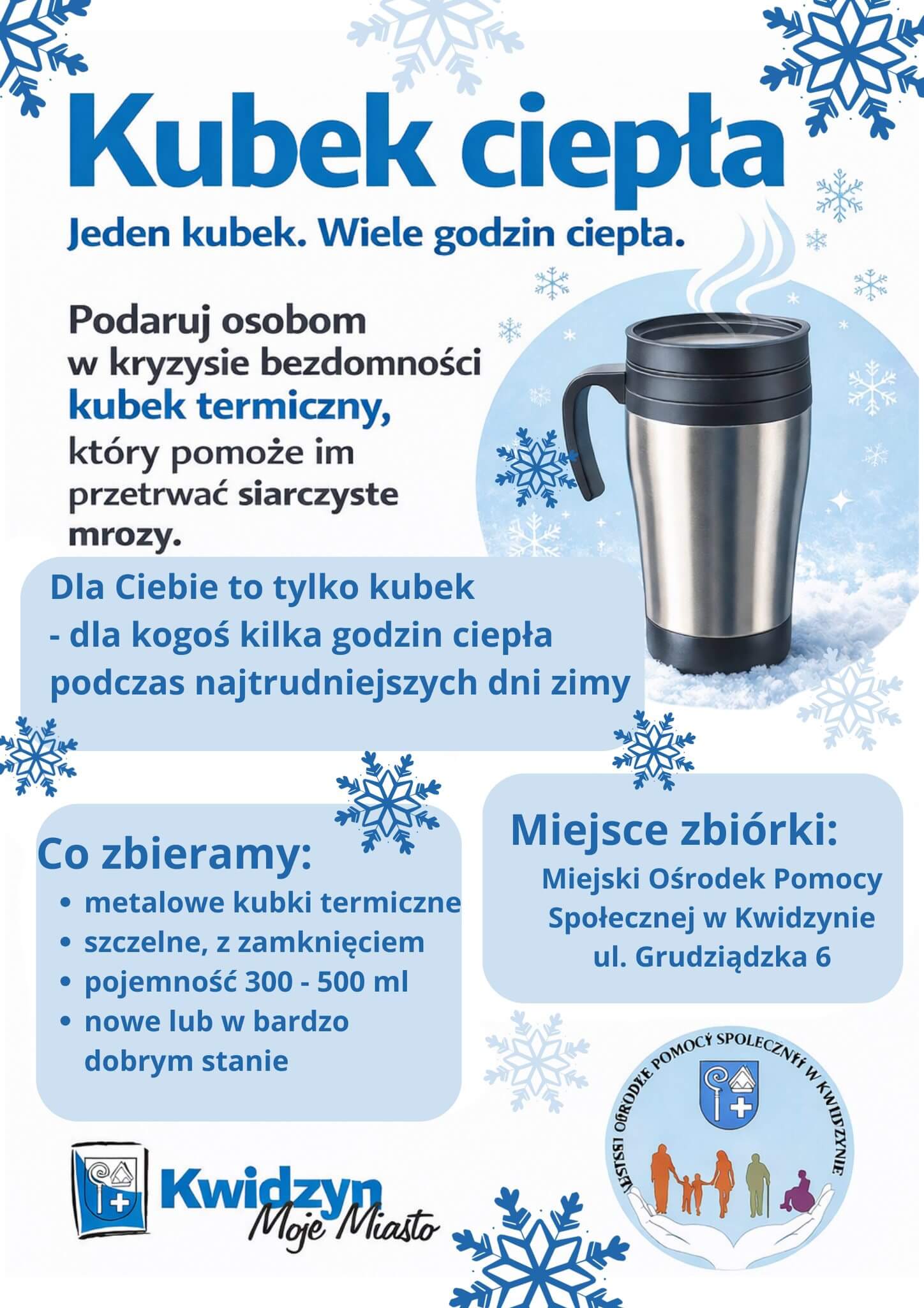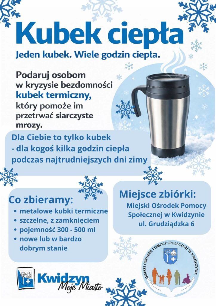 Miejski Ośrodek Pomocy Społecznej w Kwidzynie prowadzi akcję, której celem jest wsparcie osób w kryzysie bezdomności. Każdy może zaangażować się w niesienie pomocy przynosząc metalowe kubki termiczne. Muszą to być szczelne kubki z zamknięciem o pojemności 300-500 ml. Muszą być nowe lub w bardzo dobrym stanie.